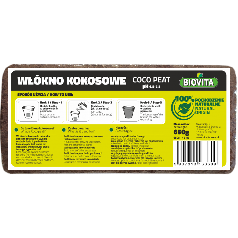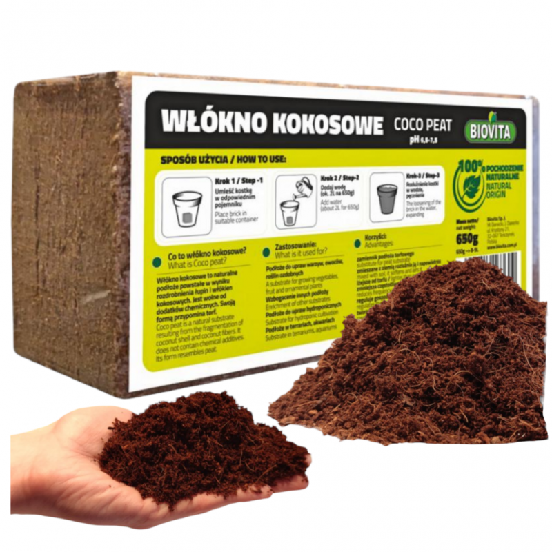 ⭐️ Włókno kokosowe COCO peat brykiet (pH 6,5-7,5) to naturalny produkt powstały w wyniku rozdrobnienia łupin i włókien kokosowych, sprasowanych w formę brykietu.
