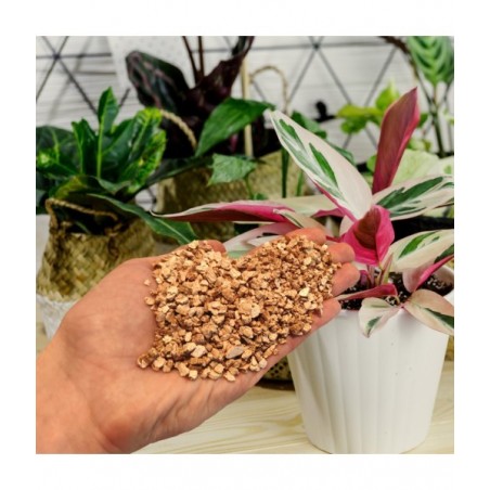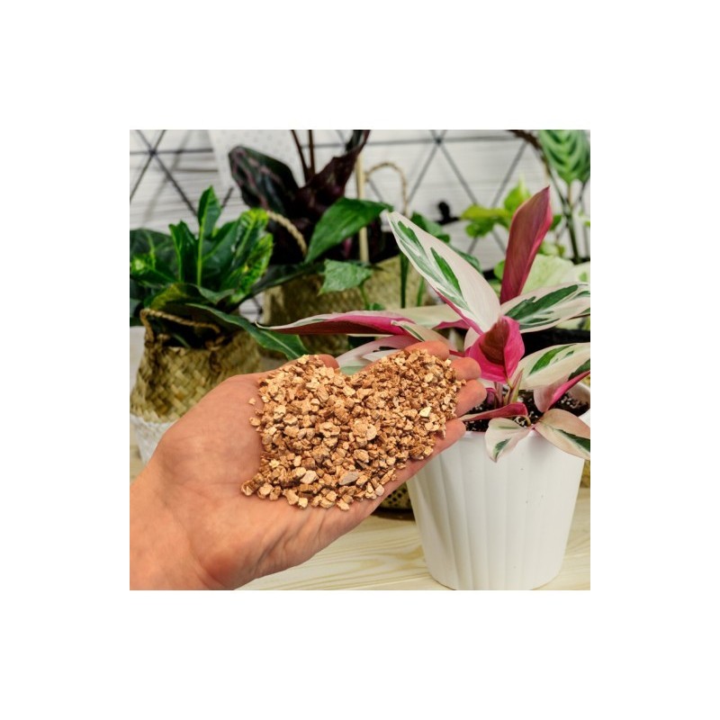 ➡️ Jako składnik podłoża, w połączeniu z torfem lub przekompostowaną korą sosnową. Zmieszany z ziemią rozluźnia ją i napowietrza. Zabieg szczególnie zalecany dla gleb ciężkich. Ponadto wermikulit wchłania wodę wraz z składnikami odżywczymi i stopniowo je uwalnia. Mieszanka taka zapewnia optymalne warunki dla rozwoju systemu korzeniowego roślin.