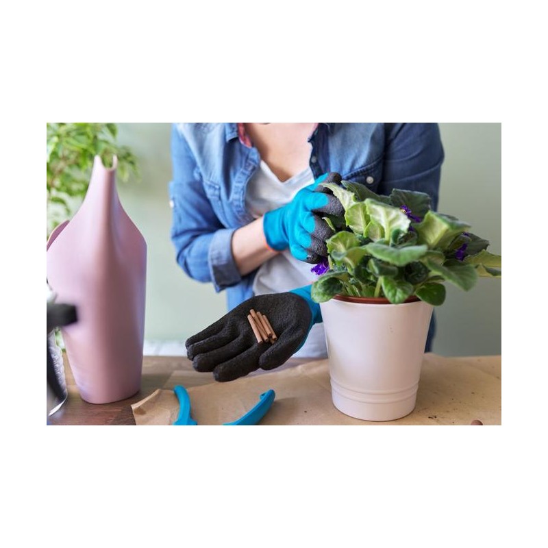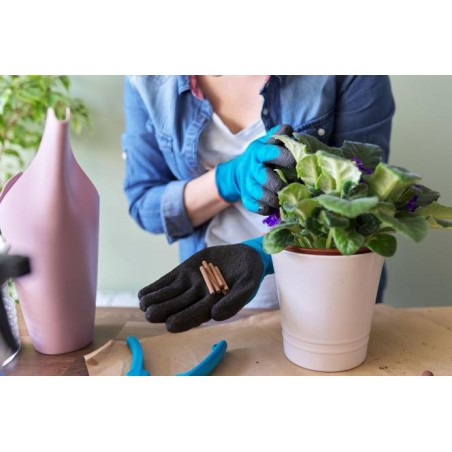 ⏩ Wcisnąć pałeczki całkowicie w ziemię między roślinę, a ściankę doniczki. Przy większej ilości pałeczek rozmieścić je w równomiernych odstępach w doniczce.