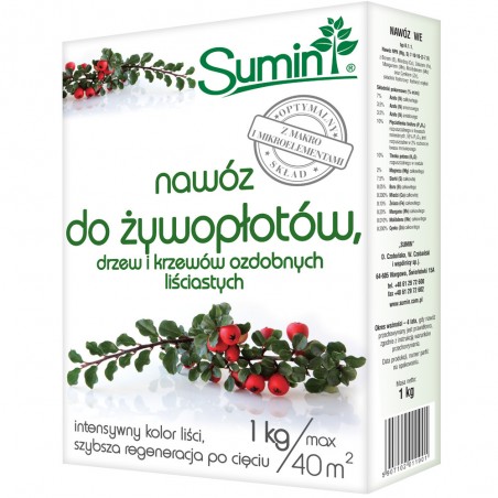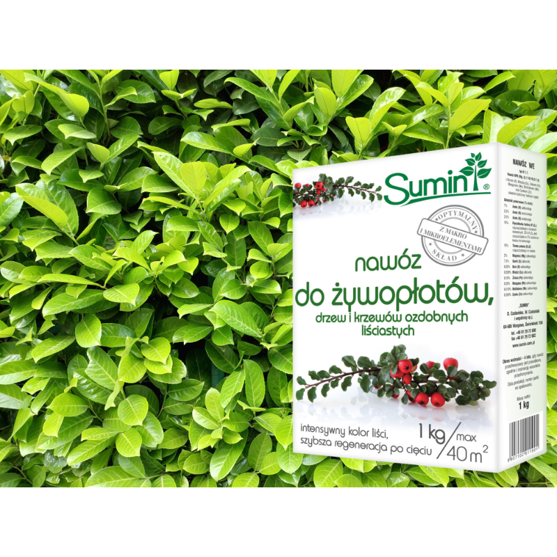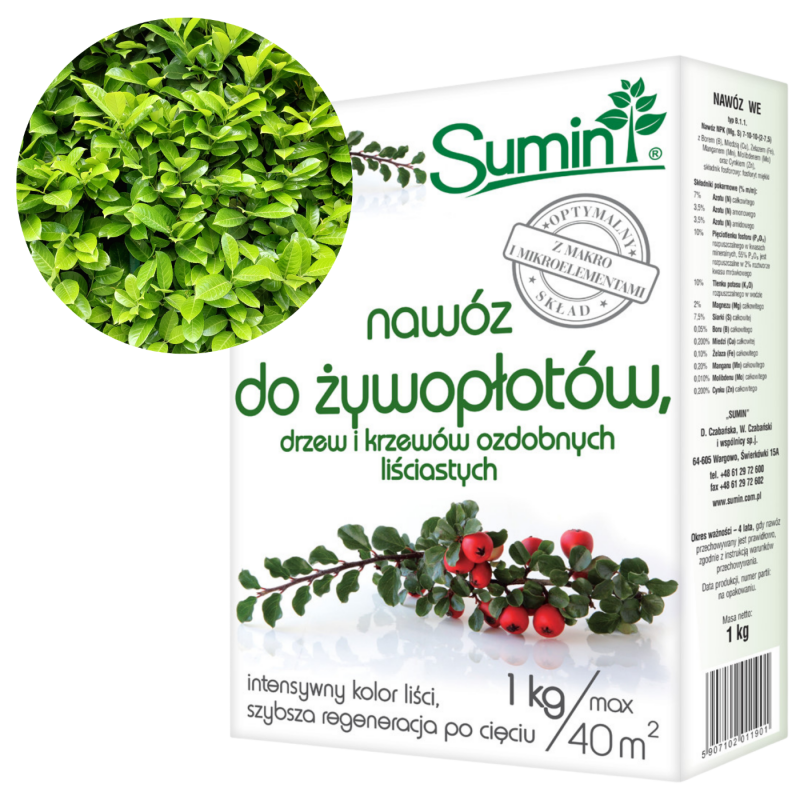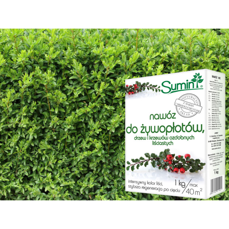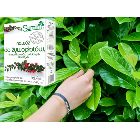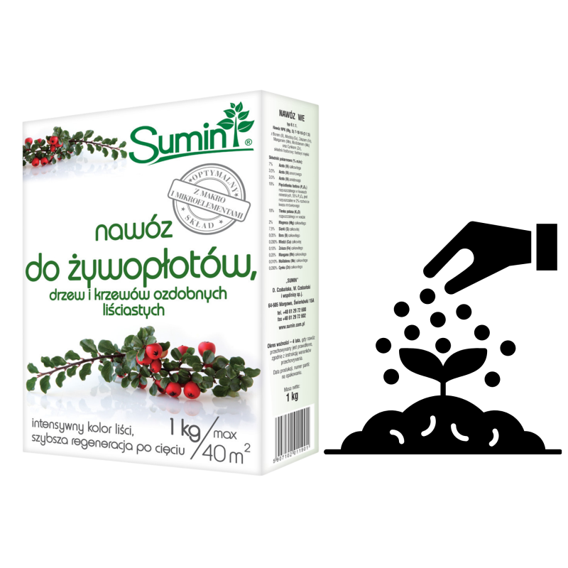 1️⃣Przy zakładaniu żywopłotów lub sadzeniu drzew i krzewów ozdobnych, ziemię z dołków do sadzenia (o głębokości co najmniej 30cm) wymieszać z nawozem SUMIN do żywopłotów, drzew i krzewów ozdobnych w proporcji 50-100g nawozu na 100l ziemi.