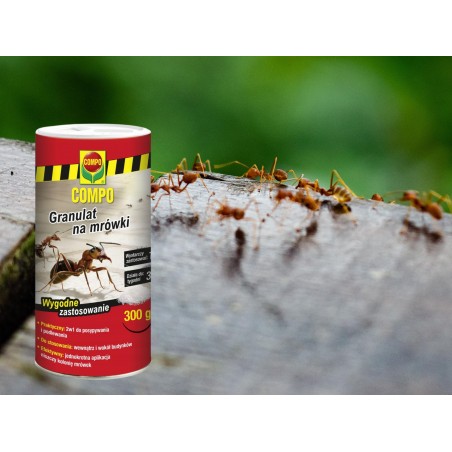 Dodać granulat przynęty do wody, dokładnie wymieszać i wlać do gniazda. Preferowane kryjówki (pęknięcia w ścianach, szczeliny w ścieżkach z płyt itp.) należy traktować ze szczególną ostrożnością. Najlepiej stosować rano lub wieczorem, gdy mrówki są w gnieździe. W domu (piwnica, garaż) stosować tylko metodę rozproszoną.