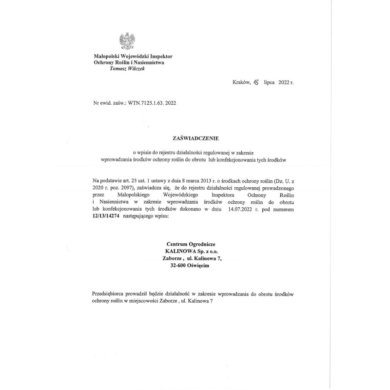 Numer wpisu do rejestru działalności regulowanej w zakresie wprowadzania środków ochrony roślin do obrotu lub konfekcjonowania tych środków: 12/13/14274