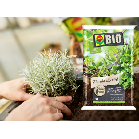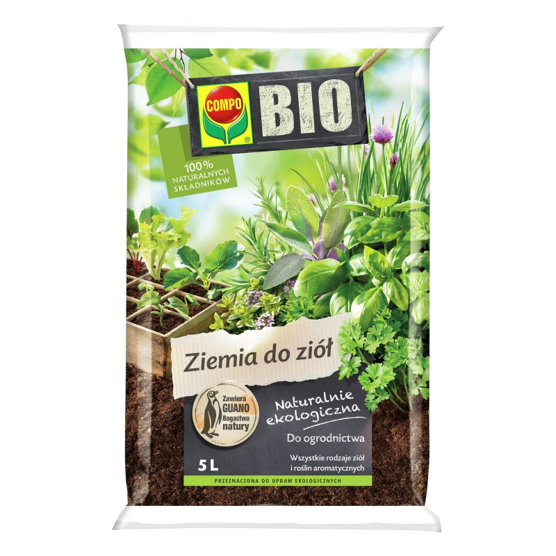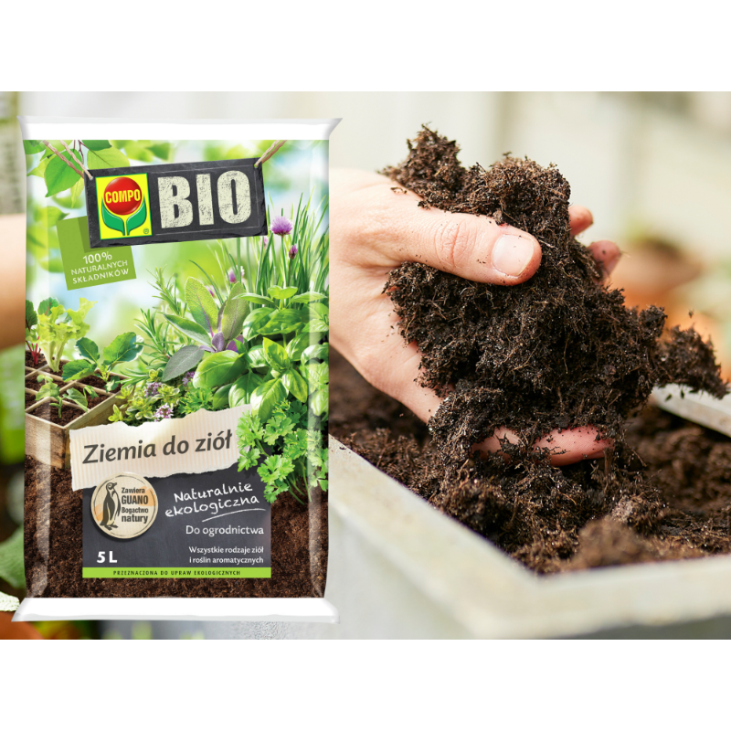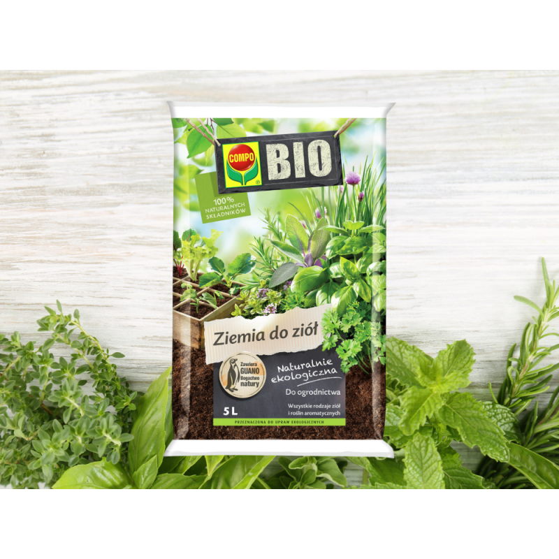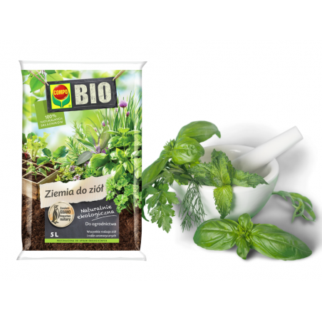Ziemię COMPO 5 l można stosować do różnorodnych ziół, m.in. mięty, rozmarynu, bazylii.